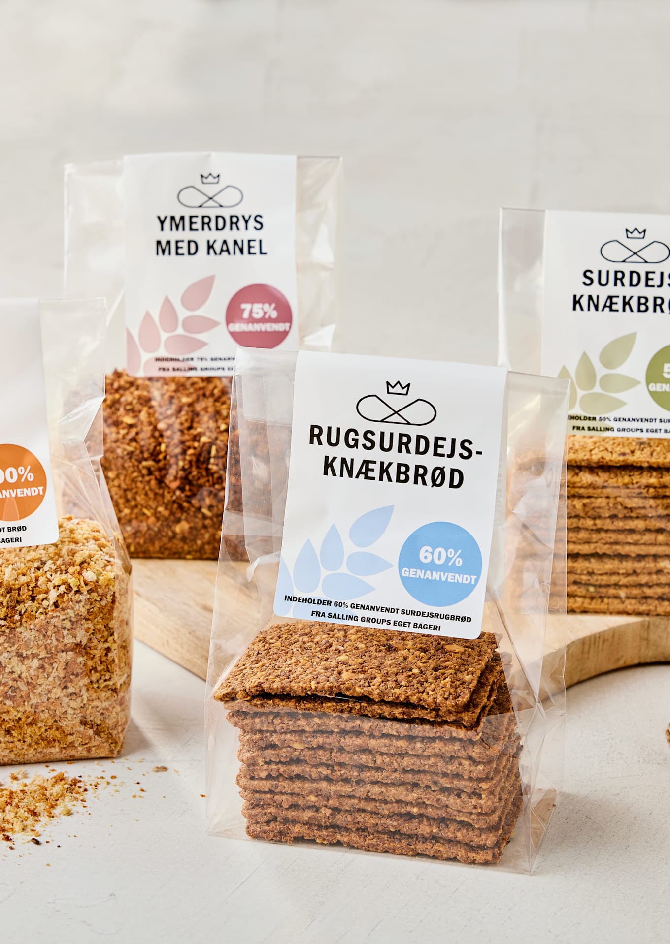 For eksempel forventer vi, at vi hvert år kan genanvende cirka 80 tons brød fra Salling Groups bagerier til nye produkter. Brød, der ellers ville være endt i skraldespanden.